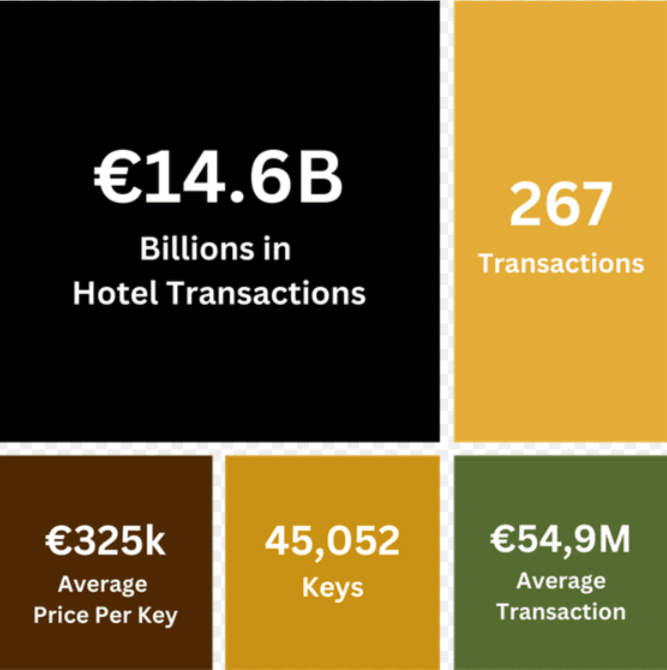The continent saw 267 transactions over the course of the year, representing €14.65bn in total volume. These deals comprised 45,052 keys, with an average transaction size of €54.9m and assets trading at €325,000 per key. Of the total luxury accounted for 34 transactions totalling €3.66bn, with an average transaction size of €107.6m.