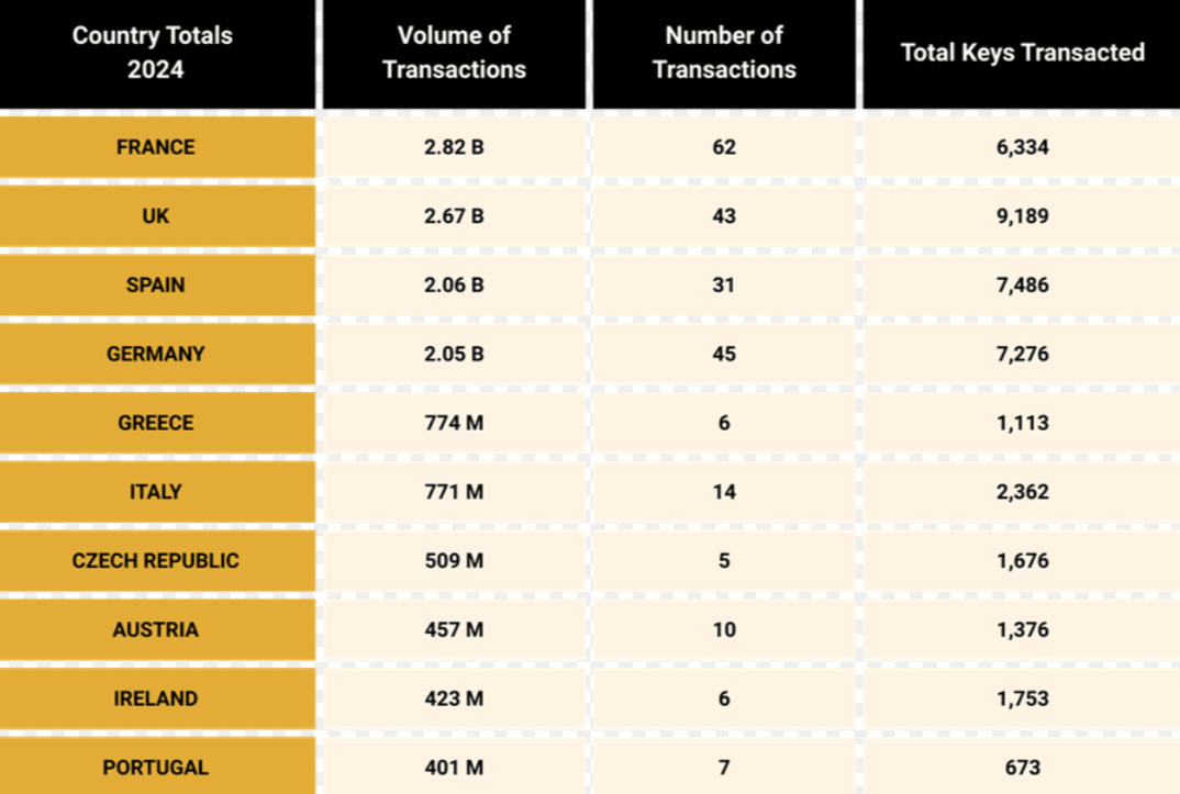 France, the UK, Spain, and Germany remained the core of European hotel investment. Together, they accounted for €9.61bn out of the total €14.65bn invested across Europe in 2025, representing approximately 66% of total transaction volume.