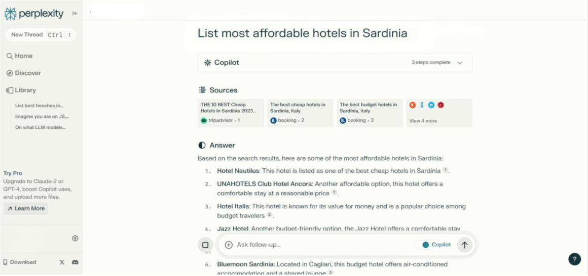 Run a simple query such as “best affordable hotels in Sardinia” in platforms like ChatGPT or Perplexity AI.