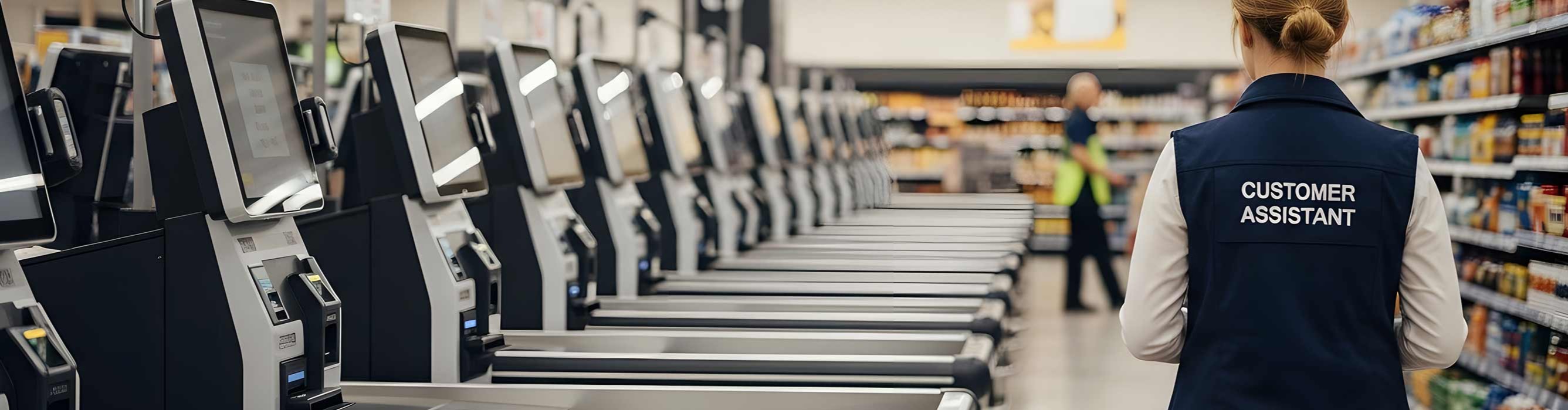 self-checkout lane and a customer assistant — © Adobe Stock