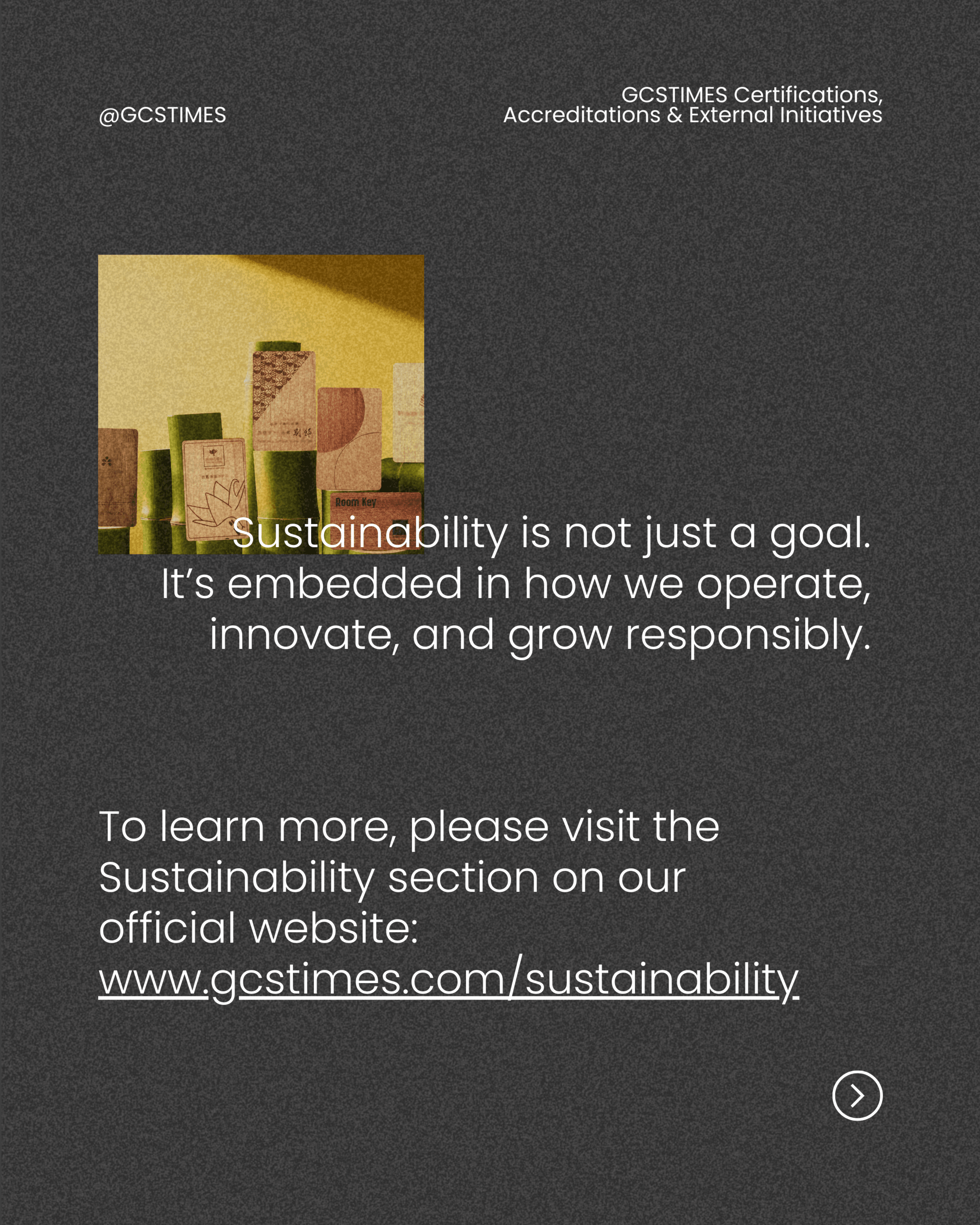 In the coming updates, we will continue to share more details about our sustainable initiatives and progress as we work toward building a more sustainable and responsible future. To learn more, please visit the Sustainability section on our official website: www.gcstimes.com/sustainability